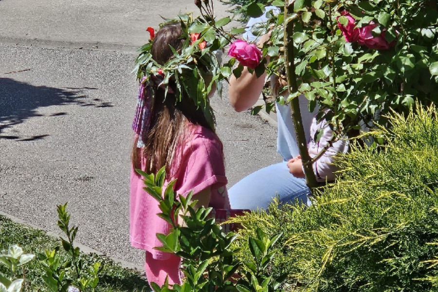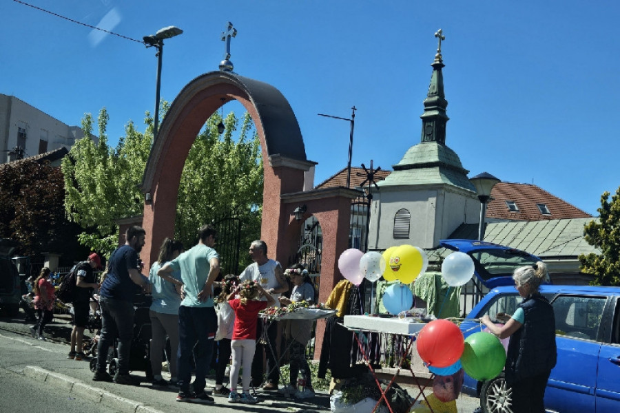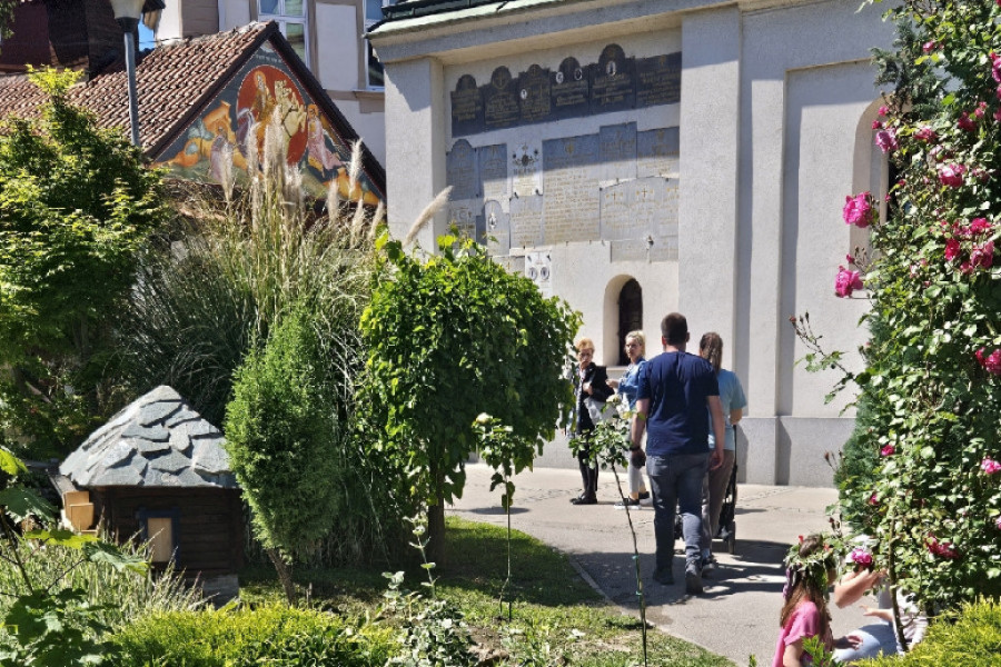 Radosna dečica nose praporce oko vrata, venčiće na glavi i zajedno sa roditeljima uživaju u prelepom dvorištu koje krasi ovu crkvu u srcu Mirijeva.